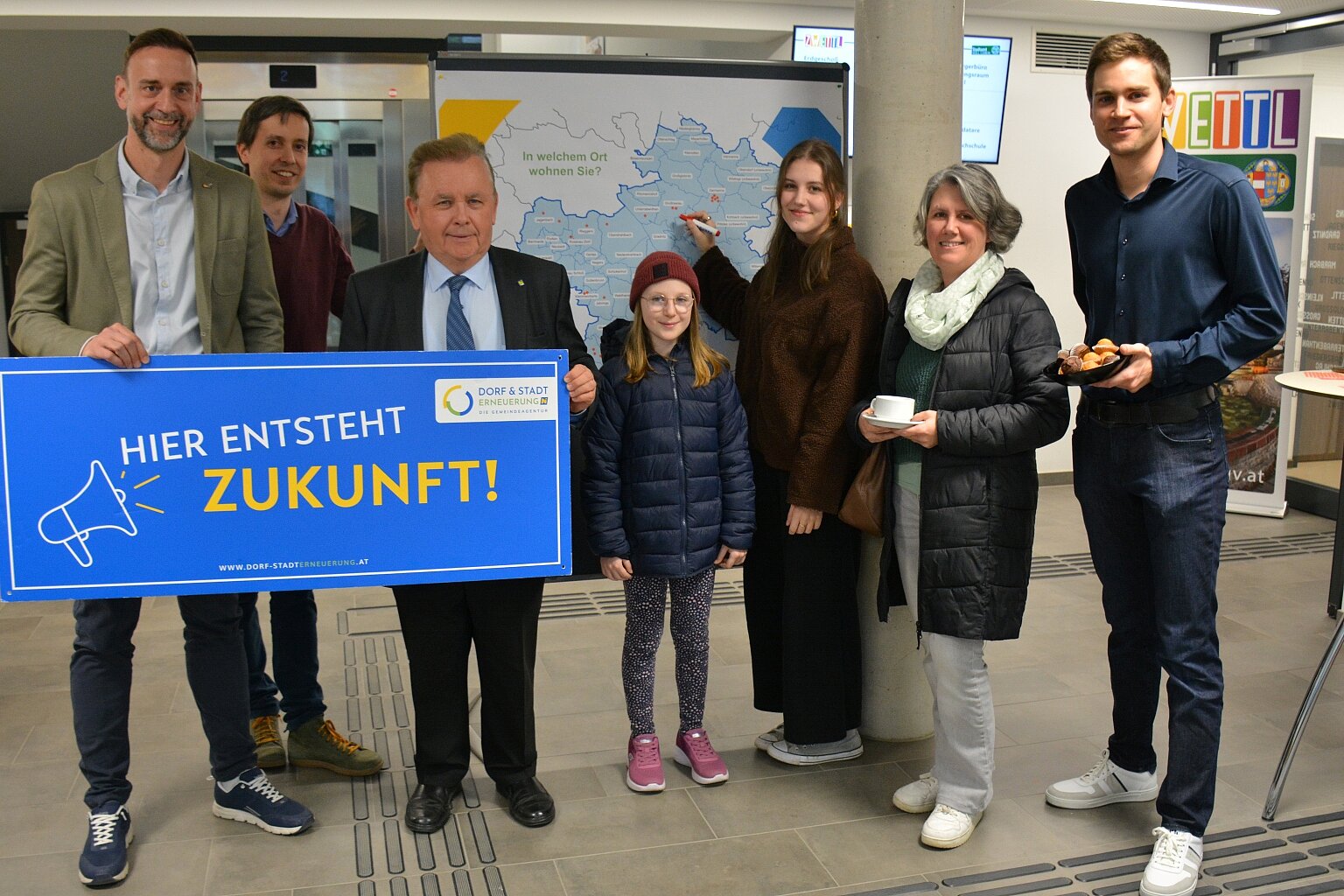 Mit 10.718 Einwohnerinnen und Einwohnern in insgesamt 56 Orten auf 256 km² ist Zwettl die flächenmäßig größte Gemeinde Niederösterreichs – entsprechend vielfältig sind die Perspektiven. Um diese sichtbar zu machen, konnten Besucherinnen und Besucher gleich beim Eingang mit Stickern auf einer großen Gemeindekarte markieren, aus welchem Ort sie kommen. Das Ergebnis: Beteiligung aus 27 verschiedenen Ortschaften – knapp die Hälfte aller Orte war damit vertreten.