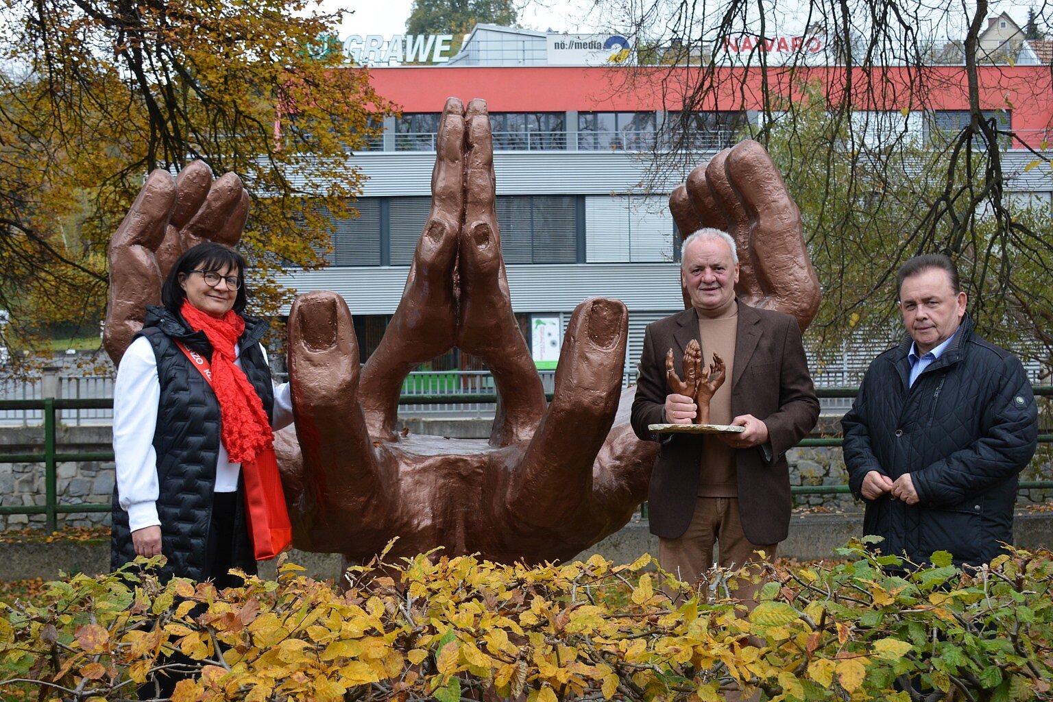 Die Skulptur „Hilfe und Dank oder die Einheit“ wurde vom Künstler persönlich, Stadtrat DI Johannes Prinz, vorgestellt. 1982 hat er die Skulptur anfangs in einem kleinen Format hergestellt. Sie hat schließlich in ihrer jetzigen Größe einen Platz vor der damals neuen Caritas Tageswerkstätte gefunden, bevor sie jetzt in der Promenade, Höhe Habsburgergasse, installiert wurde.