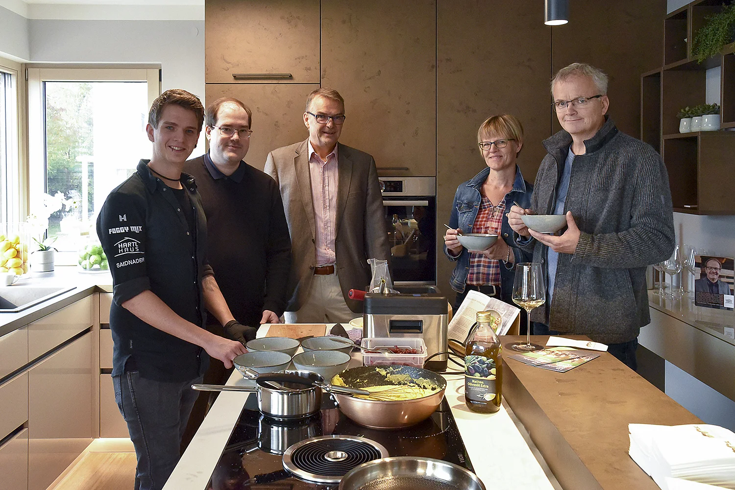 Bei der Eröffnung zauberte der Kochprofi Bernhard Zimmerl, bekannt aus der Puls4 TV-Show „Die Kochgiganten“ und <link https: www.foggy-mix.at _blank external-link-new-window internal link in current>FOGGY-MIX - Besitzer in Waidhofen/Thaya, exklusive Köstlichkeiten für die Gäste. Mit getrüffelter Polenta und sous-vide gegartem Rinderfilet ist die Einweihung der Küche aus der HARTL HAUS-Tischlerei mehr als gelungen.