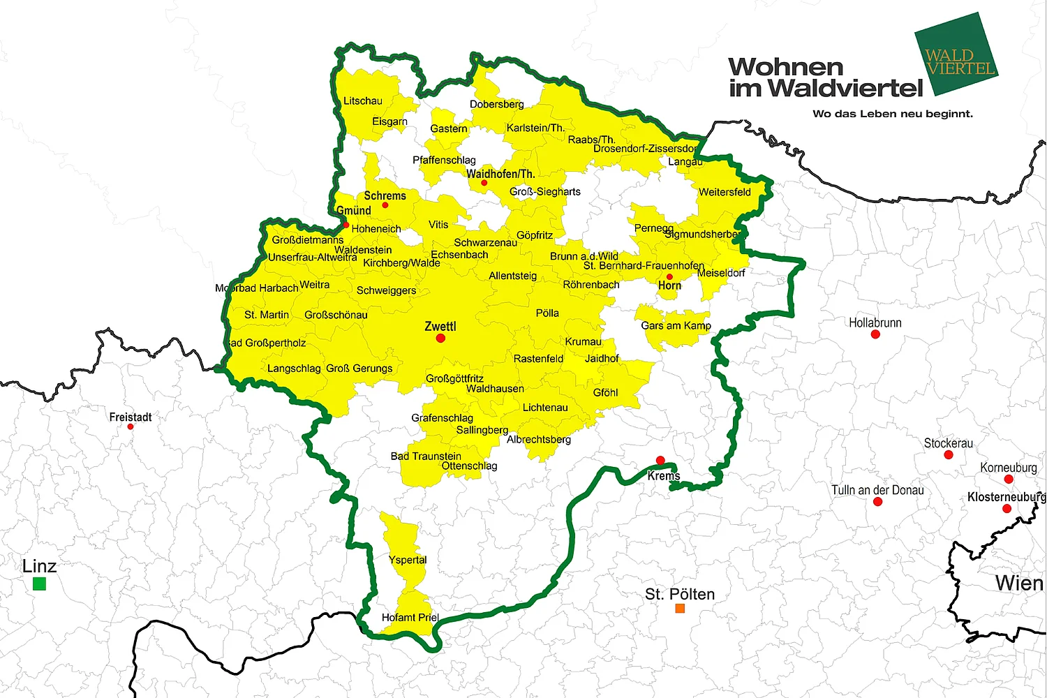 Mit 1. Jänner 2019 startete unsere Initiative "Wohnen im Waldviertel" bereits in die vierte Runde. <link 307 _blank - "Opens internal link in current window">56 Gemeinden</link> aus der Region haben sich dazu entschlossen, aktiv mitzuarbeiten und sich für die eigene Gemeinde und für das Waldviertel stark zu machen!