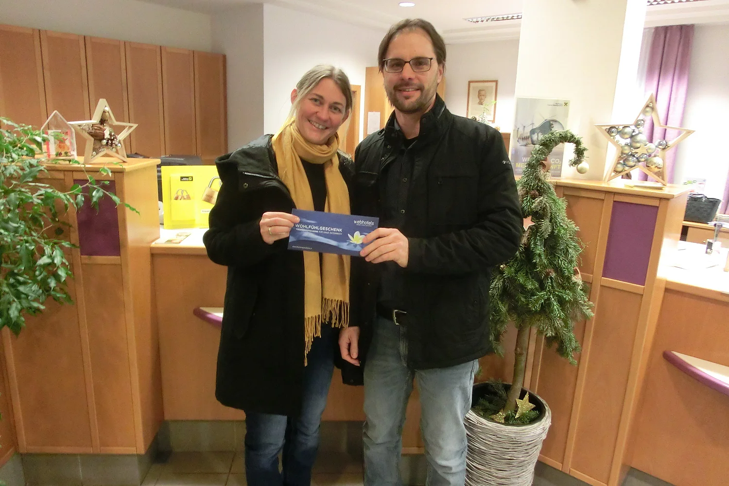 Dieses bestehend aus Thermengutscheinen und einem knallgelben Raiffeisen-Handtuch.