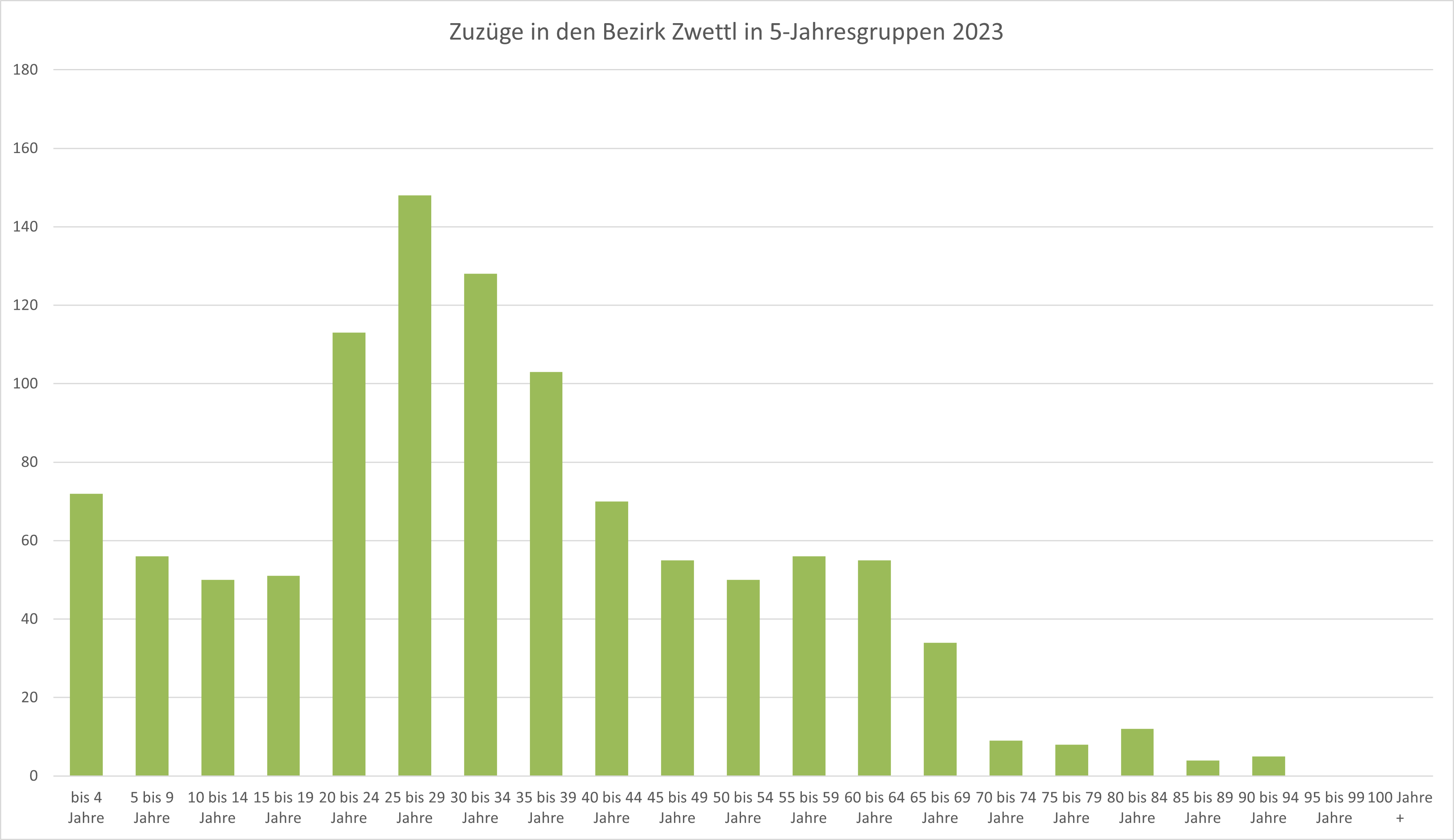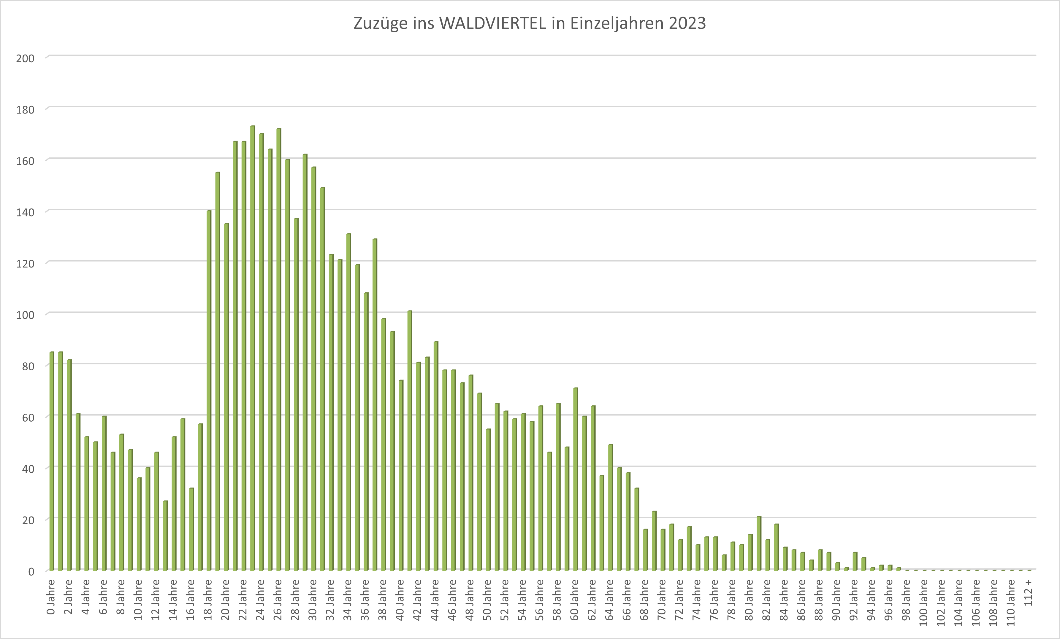 Betrachtet man statistisch das Alter der Zugezogenen (Diagramm) wird klar, - es sind nicht nur „die Jungen“, die gehen, und „die Alten“, die kommen. Im Gegenteil. Die stärkste Gruppe im Zuzug sind Menschen zwischen 20 und 37 Jahren[1], die oftmals auch Familie mitbringen!